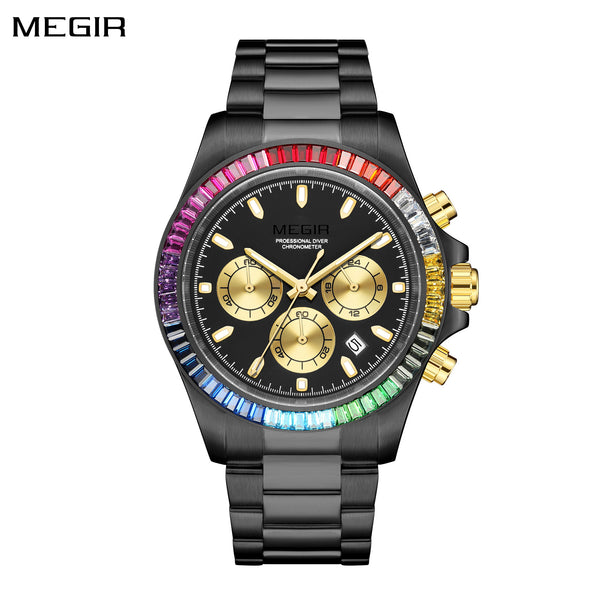 MEGIR Top Brand Luxury Mens Watches Stainless Steel Band Chronograph Gold Black Quartz WristWatch Big Dial Luminous Montre Homme 2150